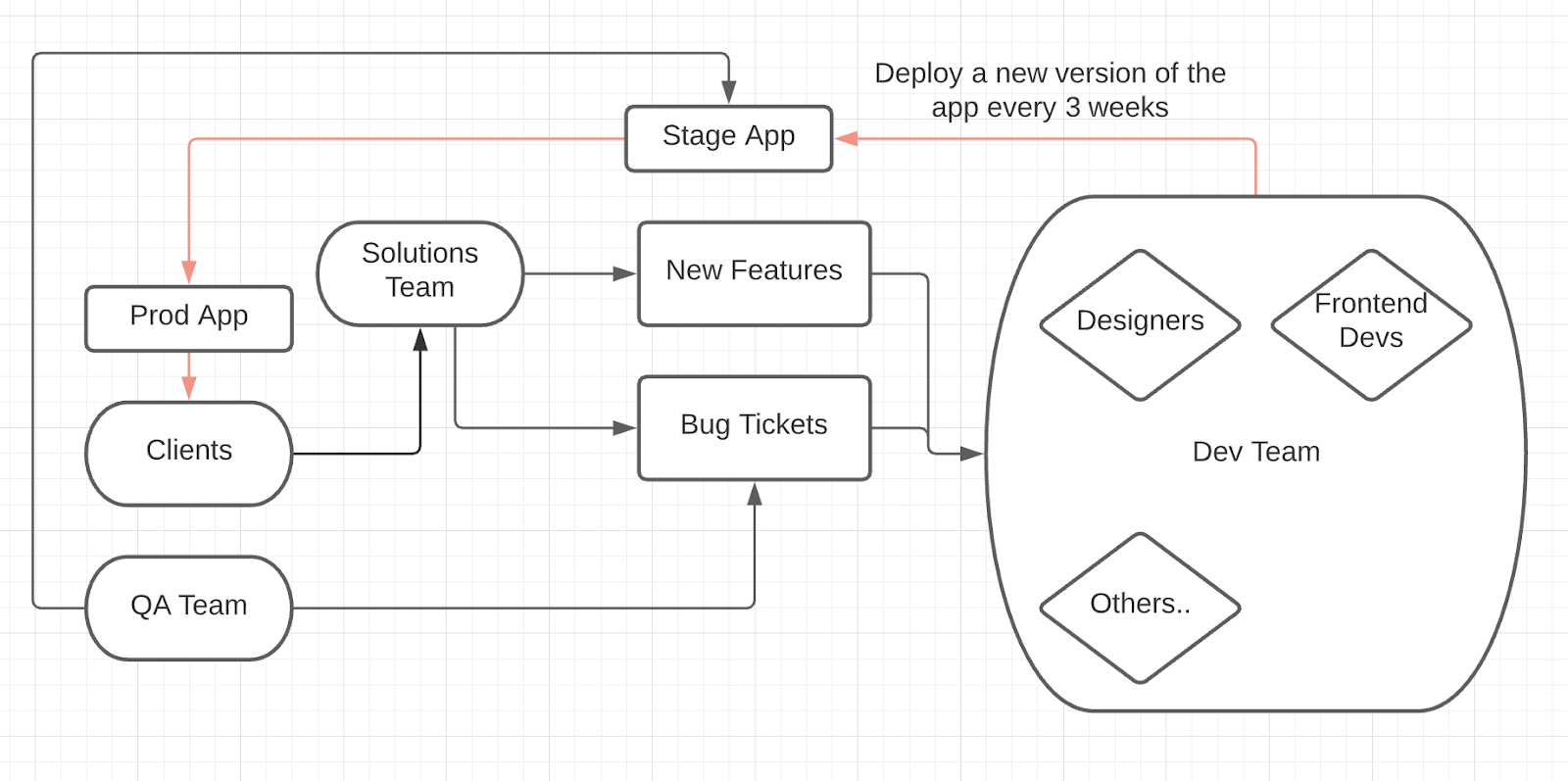 When talking to future design students at Northeastern University who would one day collaborate with developers like myself, I first showed them the entire picture of how we deploy Veoci’s software to customers. Though clients have dedicated engineers on the Solutions team who implement their specific solutions—such as for emergency management or business continuity—on Veoci, the Development team completes the internal building of the platform itself. Therefore, when a customer submits a ticket regarding the backbone of their solution that has to do with the overall Veoci system, it often goes to the Development team. In somewhat of an oversimplification, we categorize tickets as either a “bug” or a “new feature;” developers usually take care of bug tickets without input from the designers, whereas new feature requests tend to require a mockup from the designer for the developer to build.