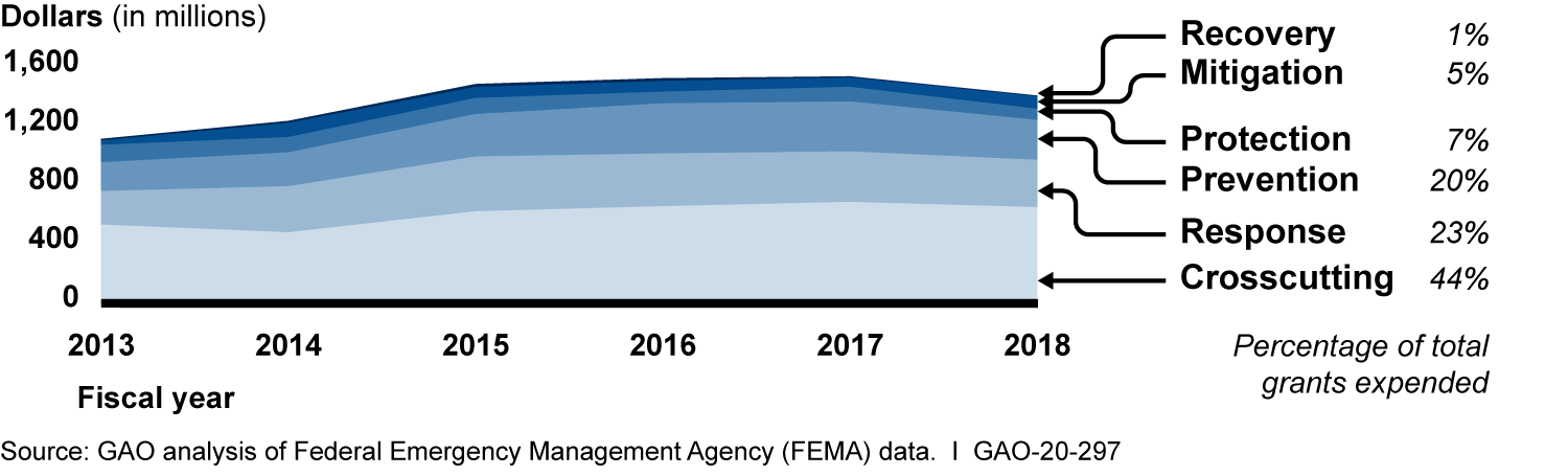 The Government Accountability Office did a study of FEMA AAR grants and found that capability gaps exist in the following areas: prevention, protection, mitigation, response, and recovery. You can see how funds are distributed across these five areas in the following table.