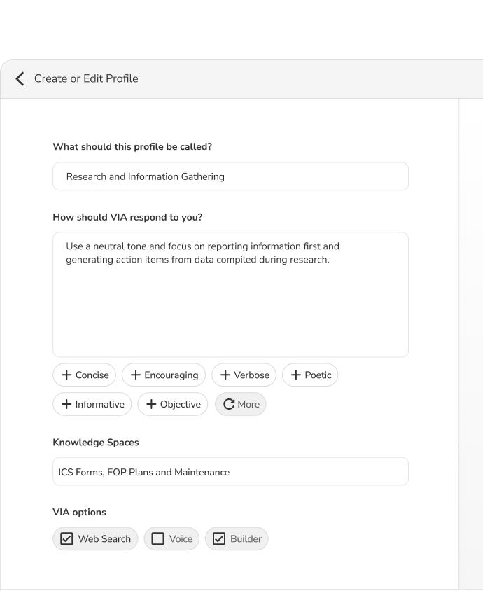 Create Knowledge Spaces, sets of specific data that help VIA target its responses to your prompts.